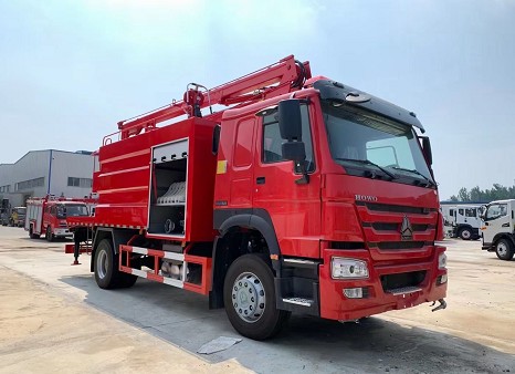 出口型重汽豪沃消防、灑水、高空作業三種功能于一體的多功能消防車_湖北江南消防車廠家